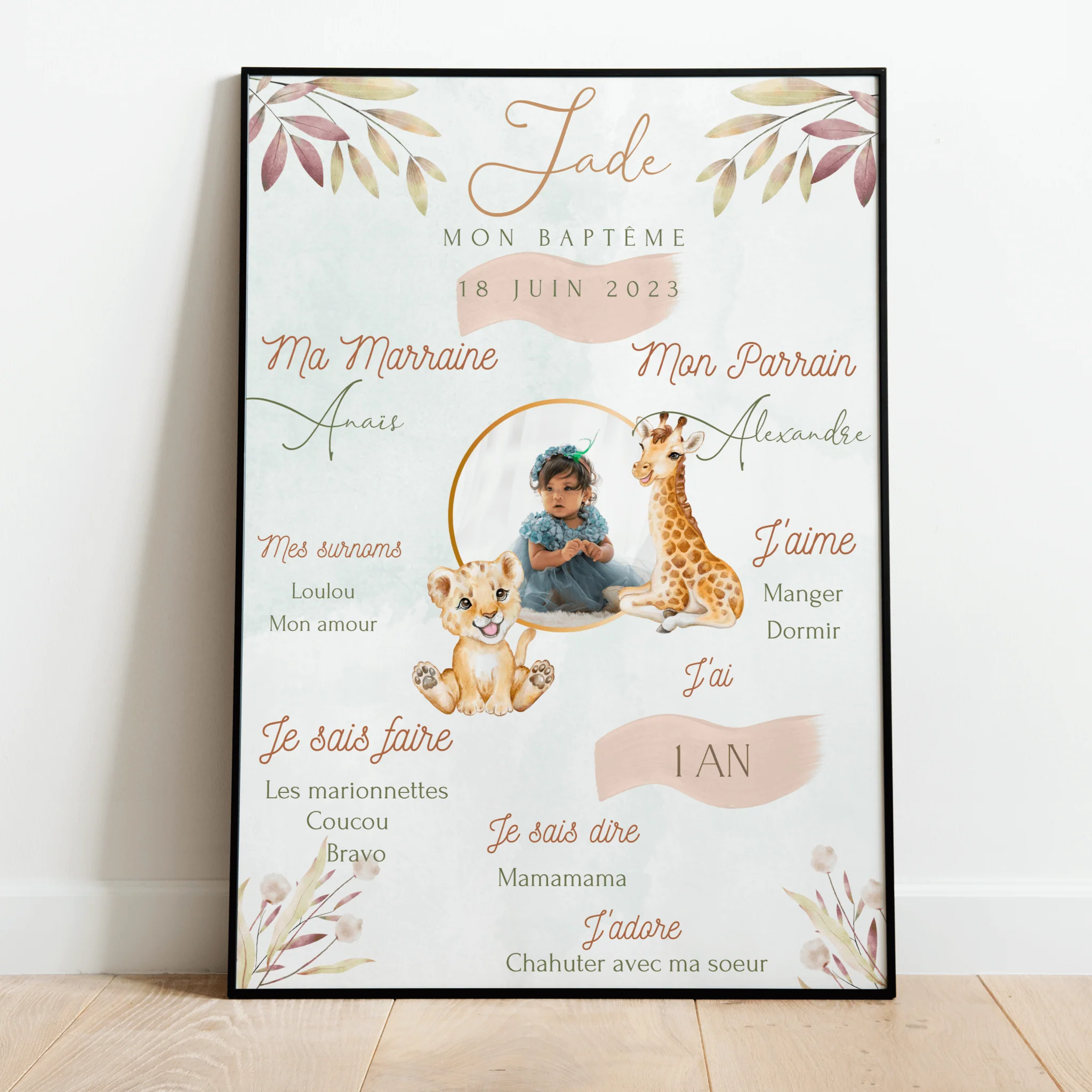Affiche personnalisable pour baptême ou l’anniversaire anniversaire de bébé. Thème Savane Pour garder un très beau souvenir de ces premiers mois/années de vie grâce à cette jolie affiche. Vendu Sans Cadre.