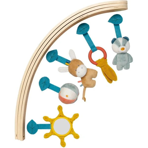 - Matériau : Bois naturel et jouets en tissus doux, hypoallergéniques.