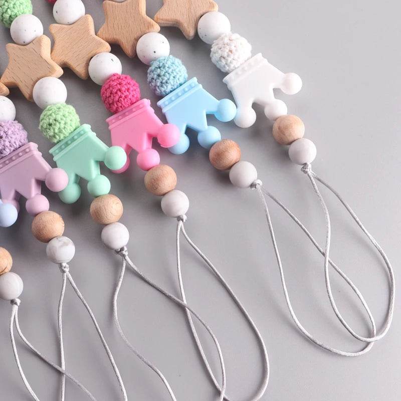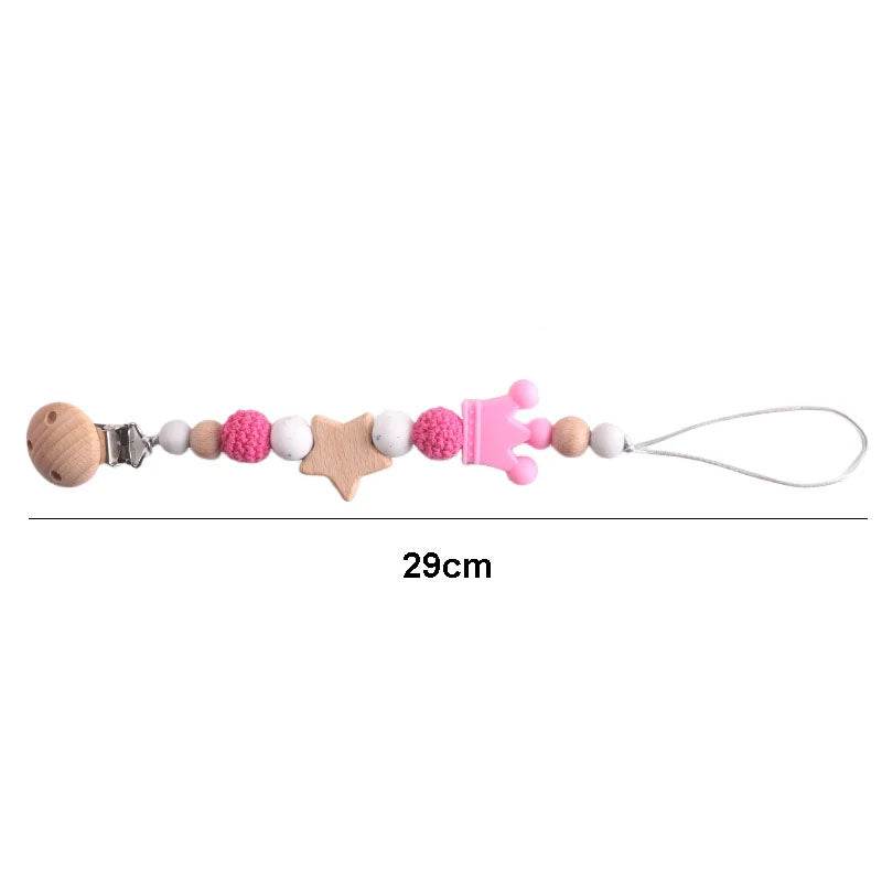 Cette chaîne de tétine combine des perles en silicone de qualité alimentaire et une perle en bois en bois en forme d’étoile pour offrir à votre bébé confort, sécurité et style.