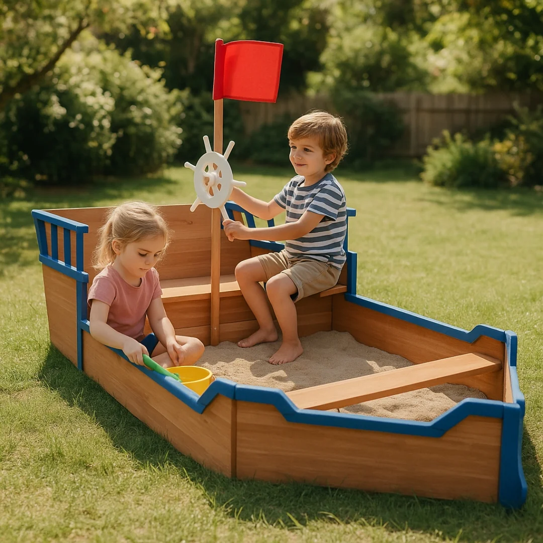 Offrez à votre enfant un espace d’aventure unique avec ce bac à sable en forme de bateau pirate (190 x 94,5 x 101 cm). Conçu en bois de sapin naturel, il est idéal pour 2 à 4 enfants de 3 à 9 ans. Son design inspirant avec gouvernail, mât, pont arrière et assise intégrée stimule la créativité, le jeu libre et la coopération. Structure stable, montage rapide, bois à huiler si souhaité.