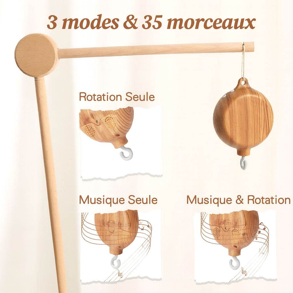 Modèle imitation bois : une version plus complète avec 3 modes (rotation, musique, rotation + musique) et 35 pistes musicales variées pour stimuler l’éveil et créer une ambiance apaisante.