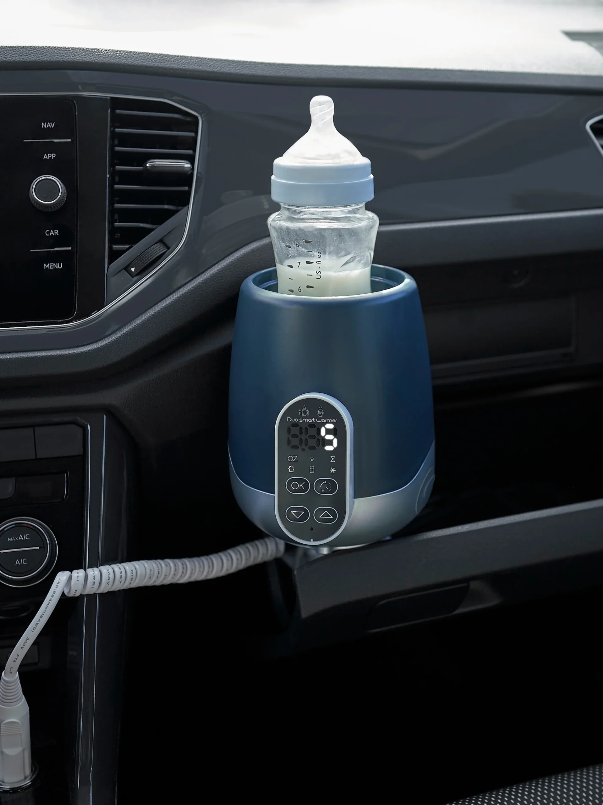 Compact, le chauffe-biberon NutriSmart s’utilise aussi en voiture avec son adaptateur à brancher sur l’allume-cigare.