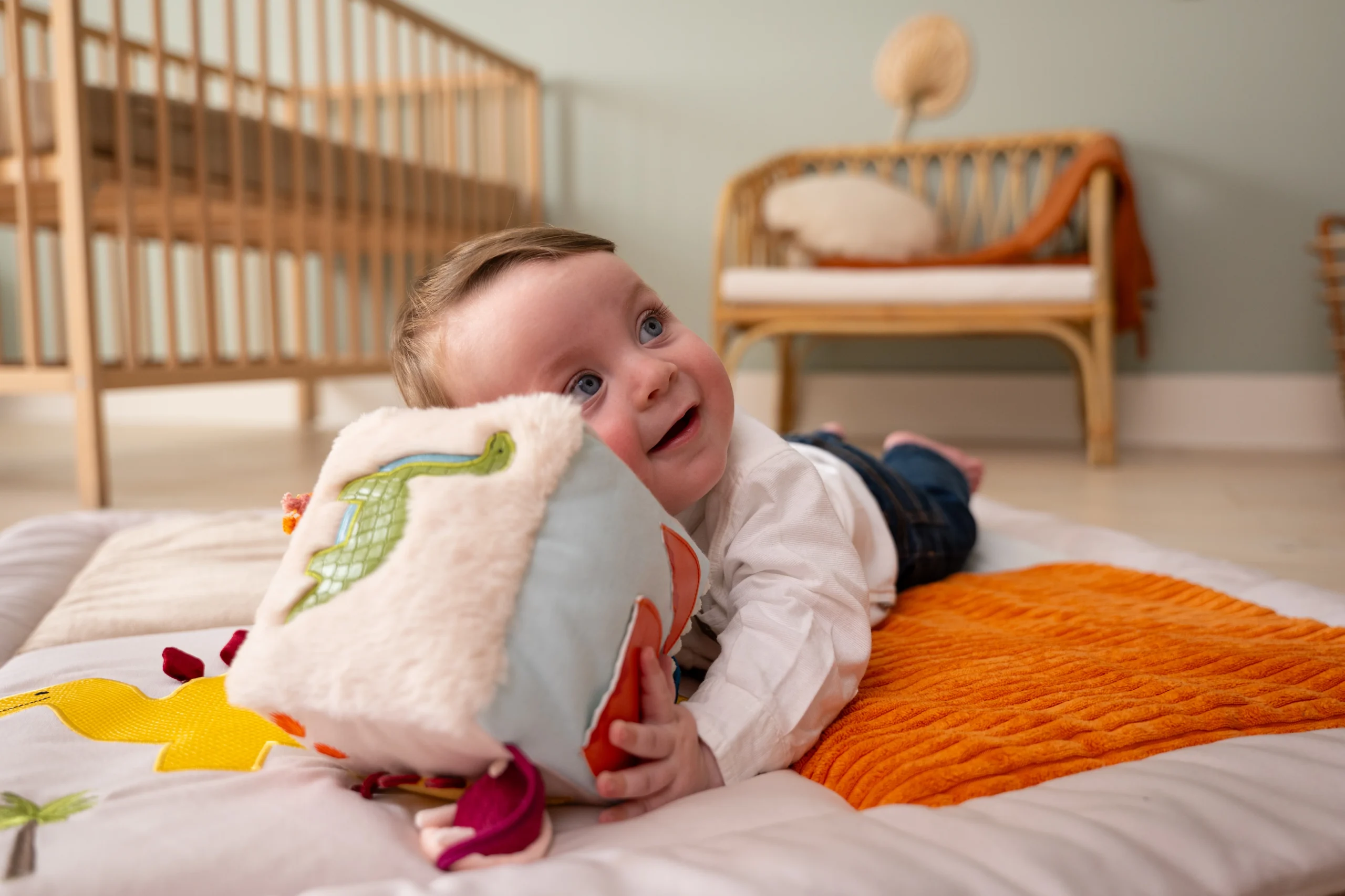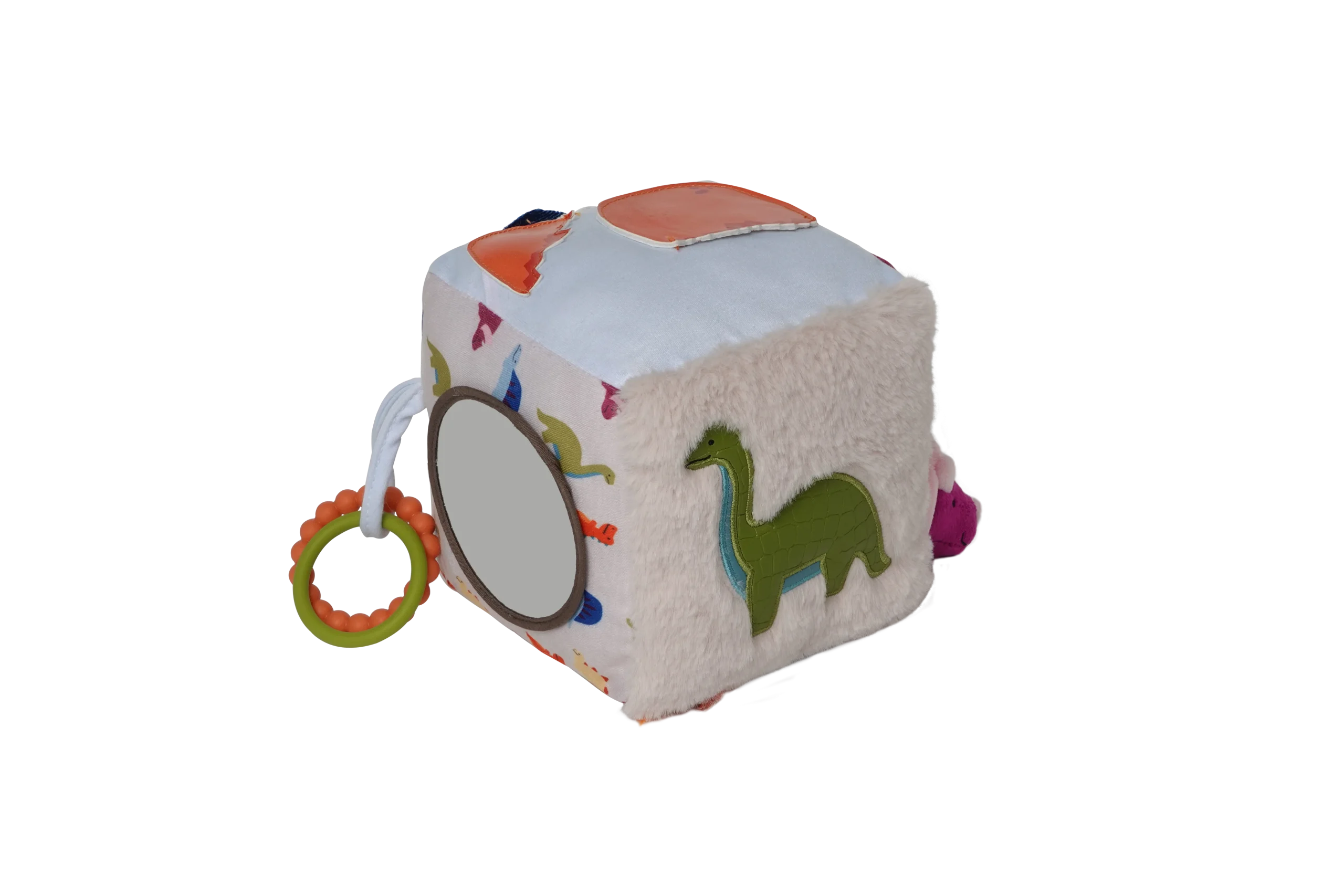 Ultra-doux, le cube d’éveil Les Amis Dino, stimule les sens de bébé avec de nombreuses textures et activités !