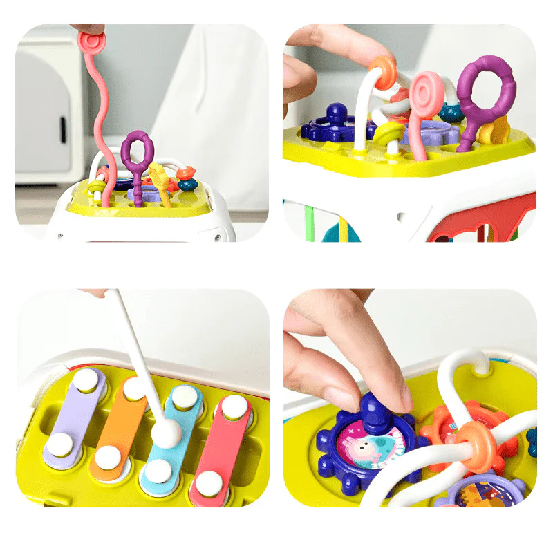Fabriqué en matériaux sûrs et durables, ce cube coloré et interactif propose des formes à encastrer, des perles à déplacer et même un petit xylophone pour une initiation aux sons et aux rythmes. Compact et léger, il s’emporte facilement pour divertir votre enfant où que vous soyez.
