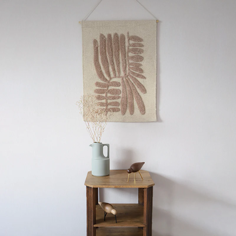 Minerva est une décoration murale originale et pleine de délicatesse. Son motif végétal rose nude est réalisé en relief sur un fond tissé en laine dans un coloris naturel écru. © Nattiot – modèle déposé