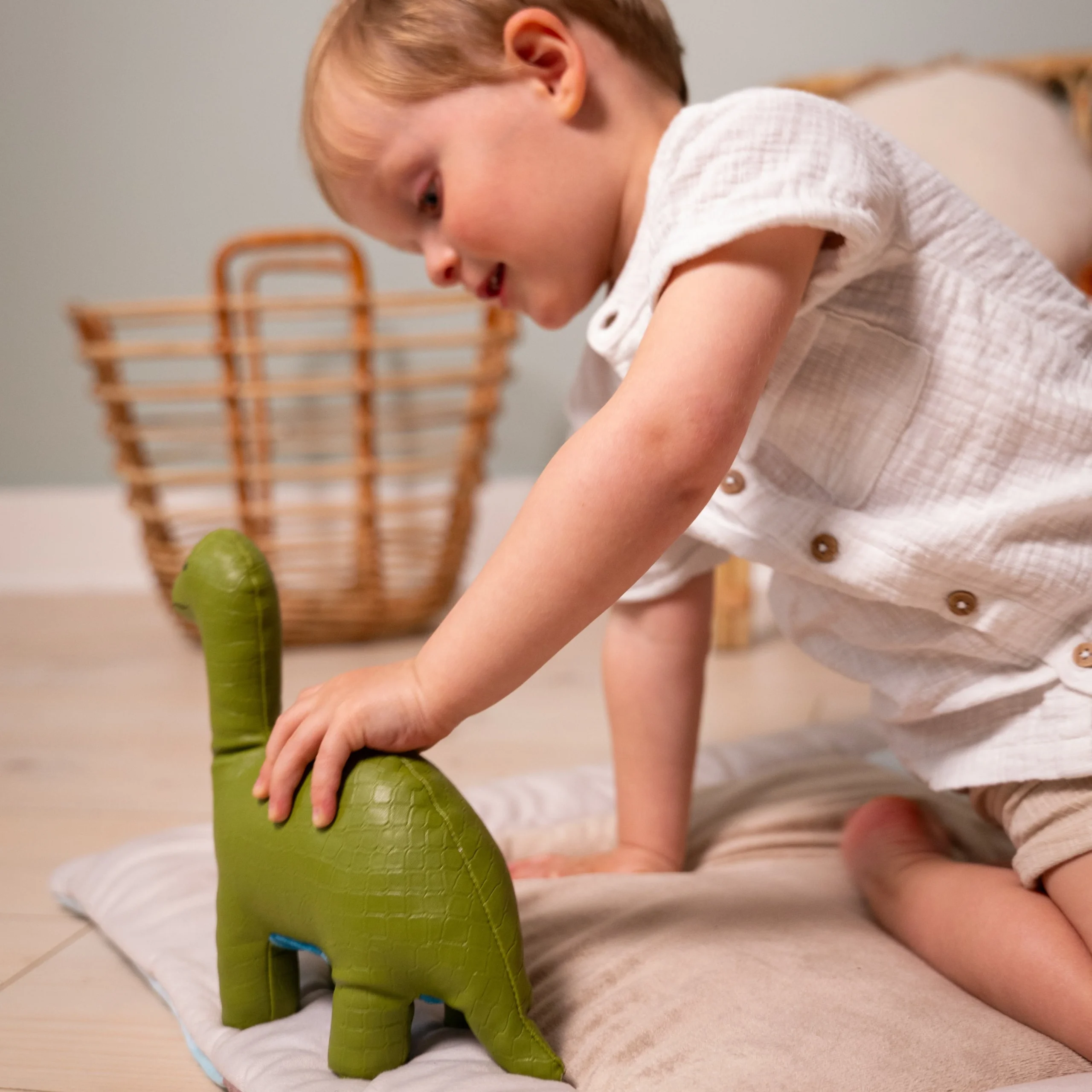 Conçu en cuir vegan, Hector cache en lui un grelot qui tinte doucement à chaque mouvement. La matière texturée de son corps vert ainsi que le tissu craquant bleu qui compose son ventre et son cou éveilleront la curiosité des jeunes explorateurs.