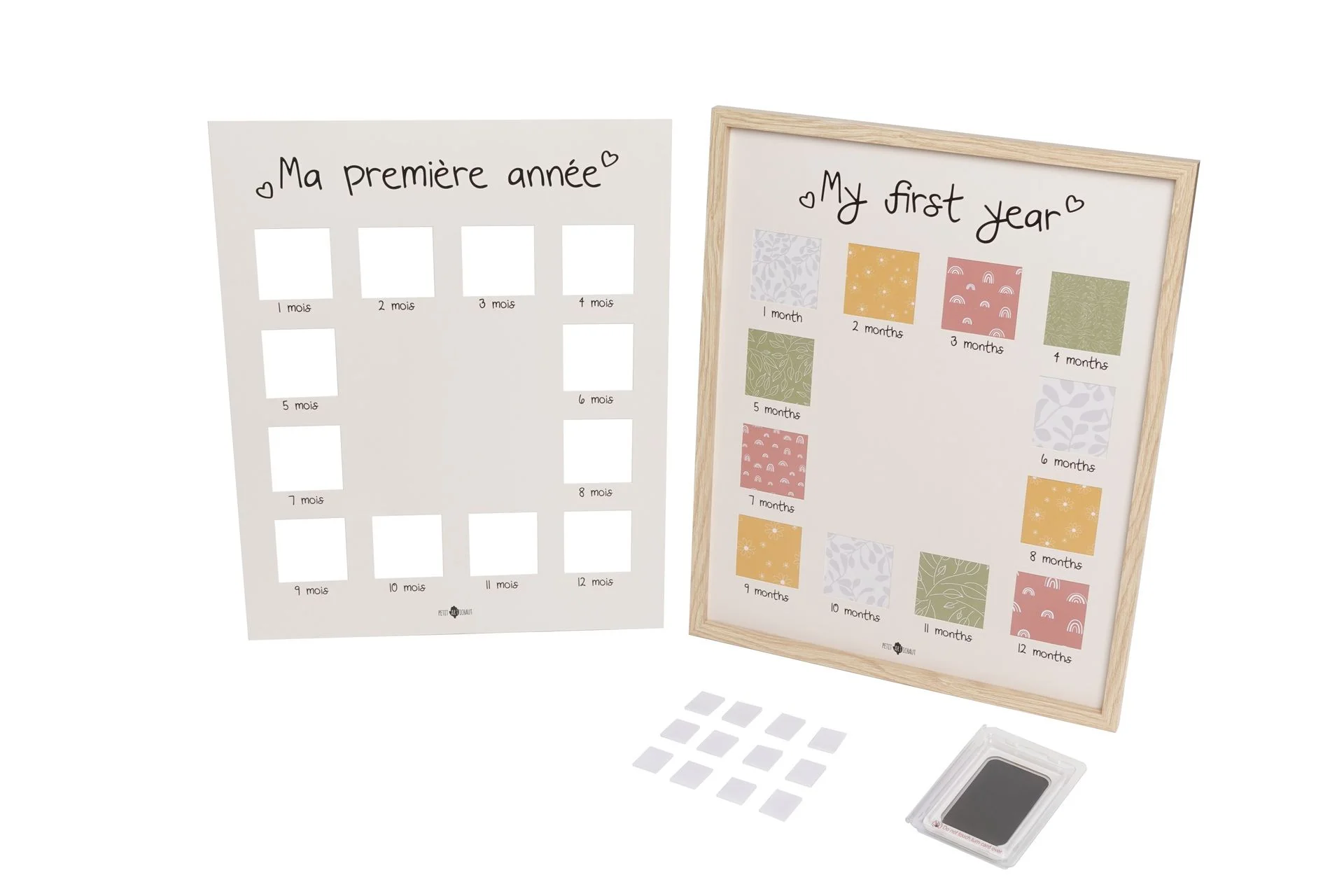 Le cadre « Ma Première Année » est recto verso (anglais/français) et son fond est décoré de doux motifs, donnant une touche design en attendant les photos des mois à venir.