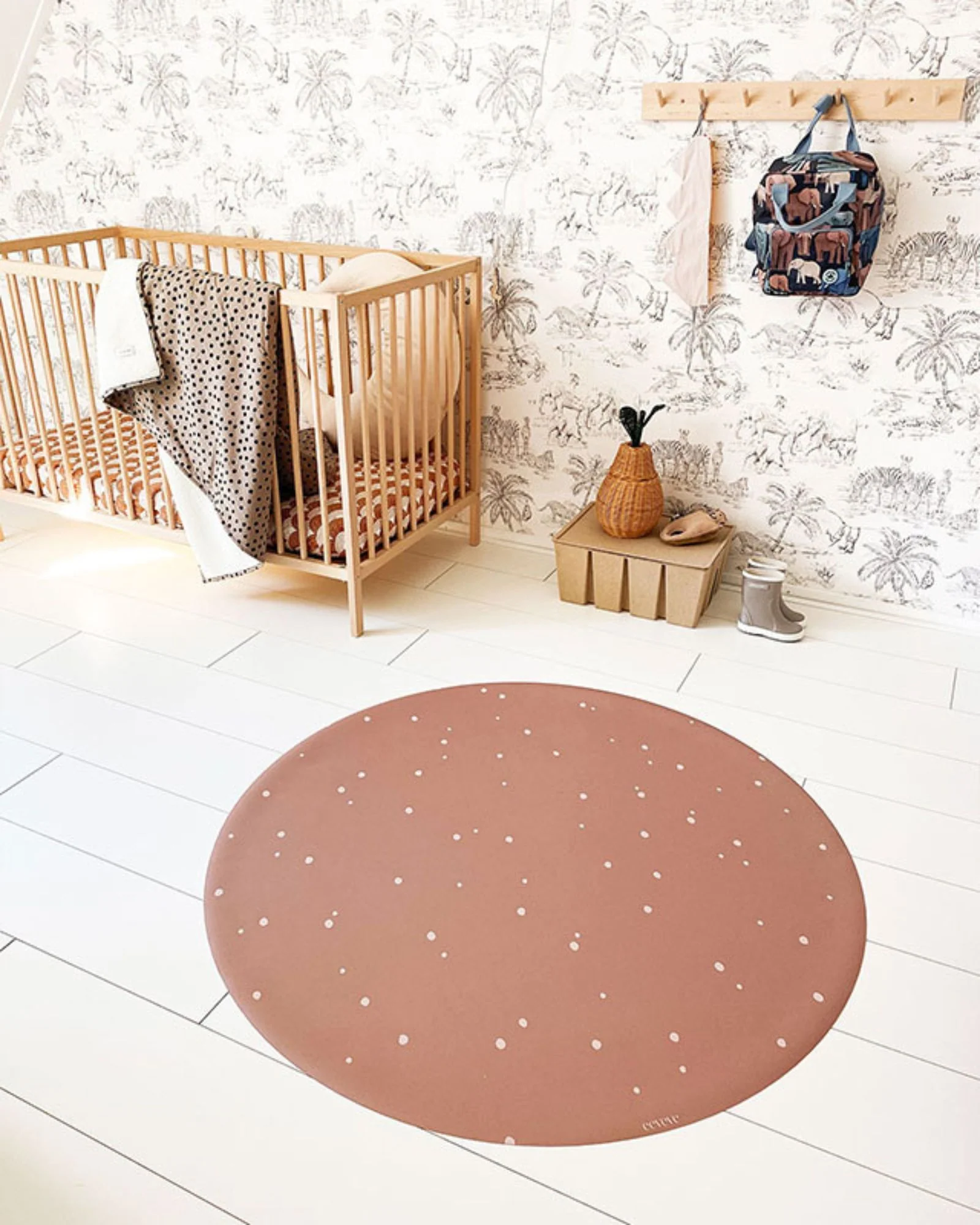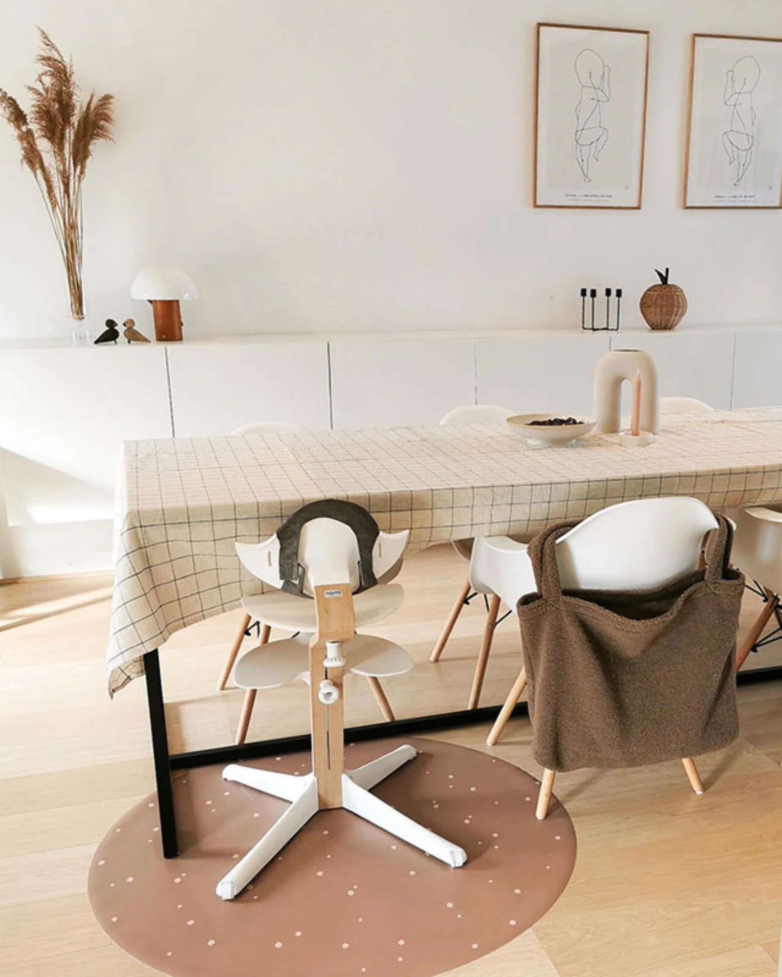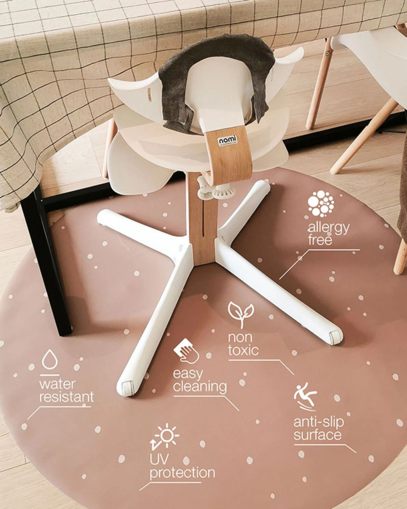 Tapis anti-éclaboussures Eeveve, une solution élégante et polyvalente pour simplifier le quotidien ! Il est protège le sol sous la chaise haute et la chaise de bureau. Le tapis de sol est imperméable, hypoallergénique et peut s’utiliser en intérieur comme en extérieur.