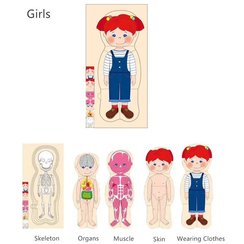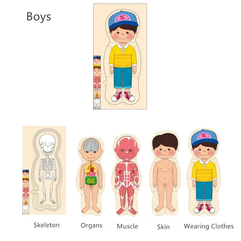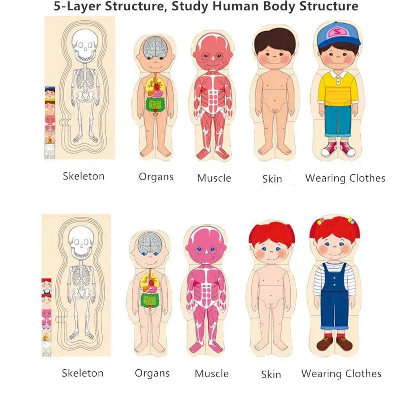 Il est fabriqué en bois de qualité, avec des pièces colorées et détaillées. Il présente les différentes parties comme le squelette, les organes, les muscles et la peau. Chaque pièce est facilement manipulable, permettant à votre enfant de comprendre comment ces éléments s’assemblent pour former le corps.