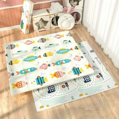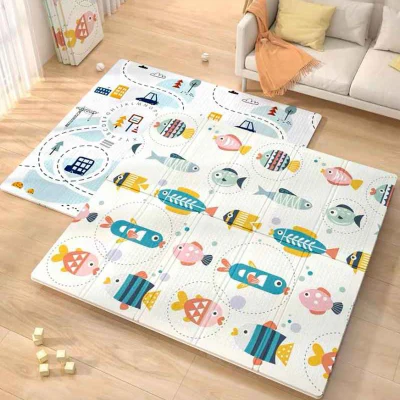 Tapis mousse bébé imprimé de poisson colorés et du paysage urbain pour l'éveil visuel.