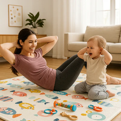 Maman et le tout petit en plein exercices fitness sur le tapis mousse bebe