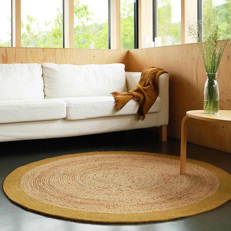 Ce tapis naturel tri-matière est composé de jute, laine et coton. Un mélange de matière et technique étonnante : ainsi un épais cordon de coton est recouvert de laine feutrée. Ce cordon au cœur en coton a pour mission d’ajouter de la tenue et de la résistance au tapis. Le centre du tapis est tressé à la main en pure jute, puis fini par cette bordure en laine au nuances de mangue. Le rendu final est particulièrement qualitatif et fait de ce tapis un élément sobre et design à accorder aisément à tout type de déco.